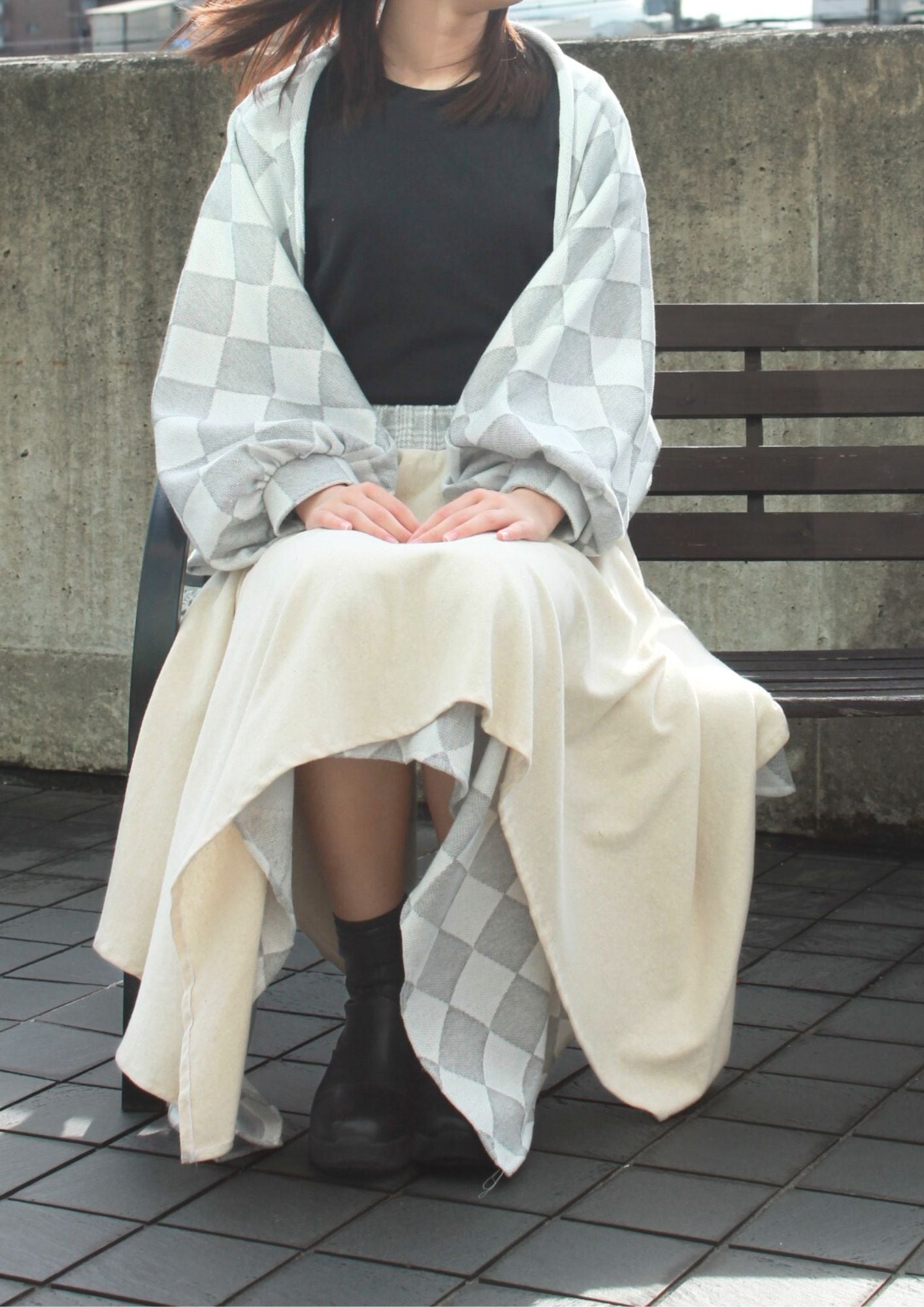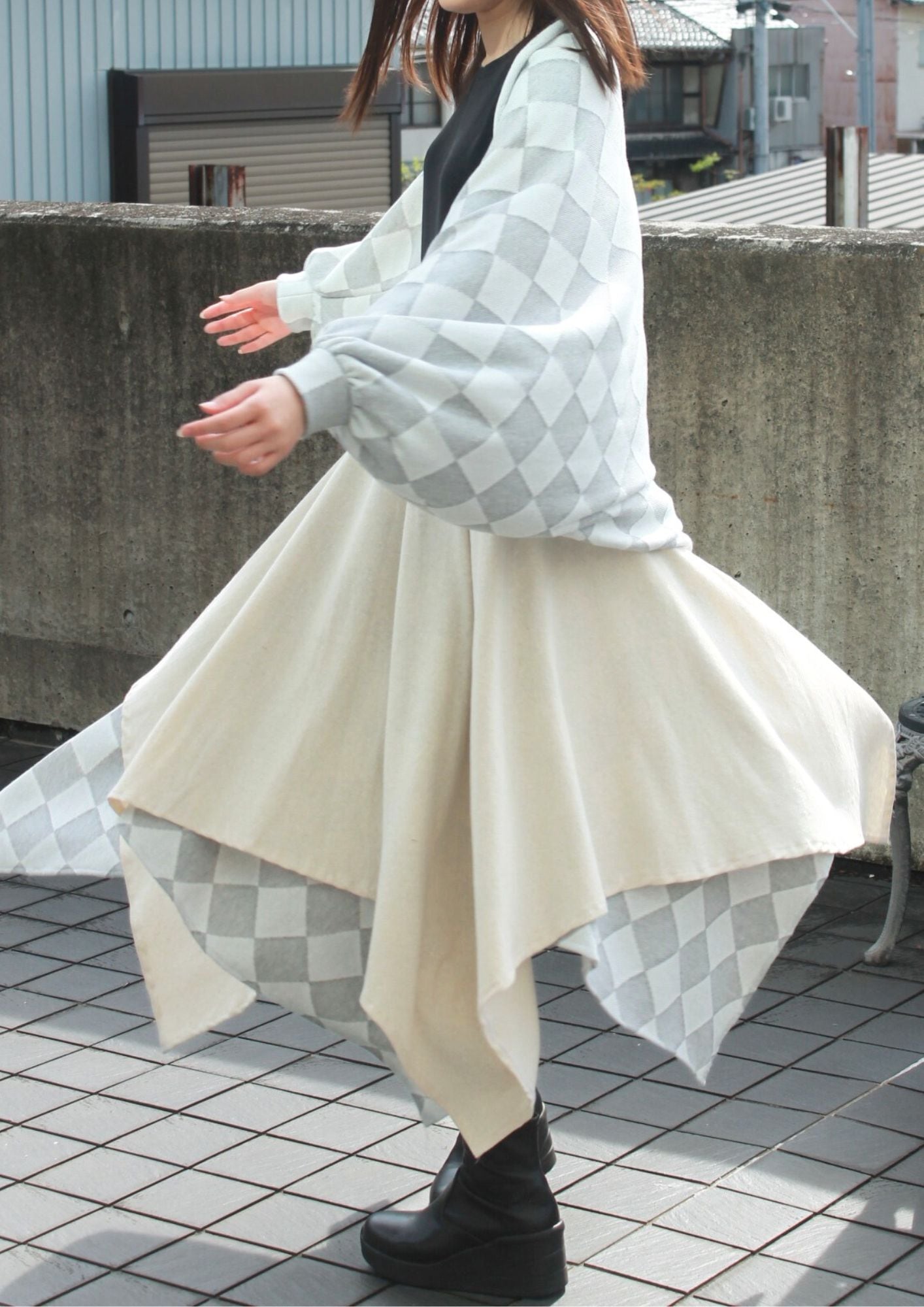 正方形の布を重ね合わせることで動きのあるデザインになっています。